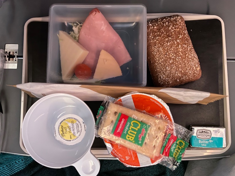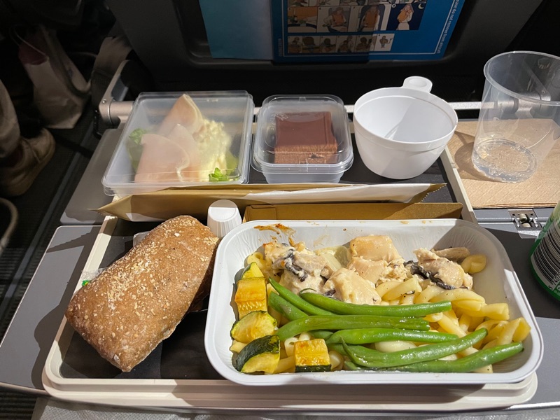 起飛後不久一人先發一罐礦泉水,軟性飲料給過一輪之後開始收費。但途中空服員還是會拿著大罐礦泉水分發給有需要的人。飛機餐只有一種沒得選,但是比花花綠綠經濟餐好吃很多。澱粉蛋白質蔬菜甜點一應俱全,沒有發黃的花椰菜這點要加分。餐後照例提供熱茶熱咖啡。基於某種神祕原因,我總覺得飛機上的熱紅茶特別好喝 :)
