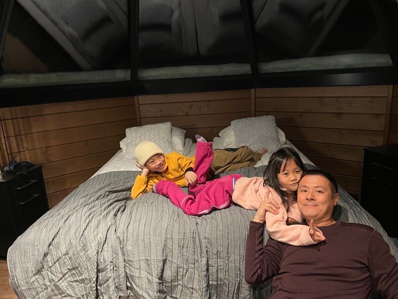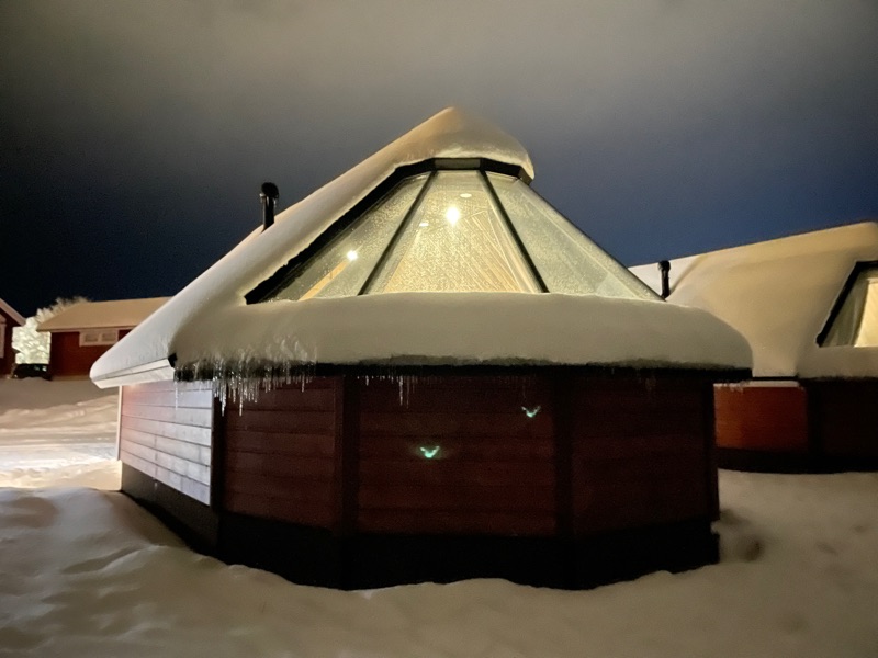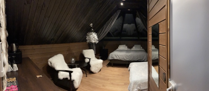 抵達Inari時已經是晚上9點多,這次我們訂的是Visit Inari極光玻璃屋,湖景第一排。 左邊第一間是Sauna,其餘8間是極光屋。當初下訂時這幾天特價,二大二小含早餐一晚€335,比起其他極光屋動輒一晚五六百真的是佛心價。小屋玻璃屋頂直接面對Lake Inari,視野遼闊沒有光害,是追極光的好地點。屋內有一張king size bed和鋪好的sofa bed。有微波爐熱水壺和冰箱,到處都有插座,地板有加熱超級溫暖。衣服襪子濕掉的話在地板上烘一個晚上就乾了。 我們有3大咖行李箱,每個都可以打開攤在地上,室內空間算是非常寬敞舒適。
