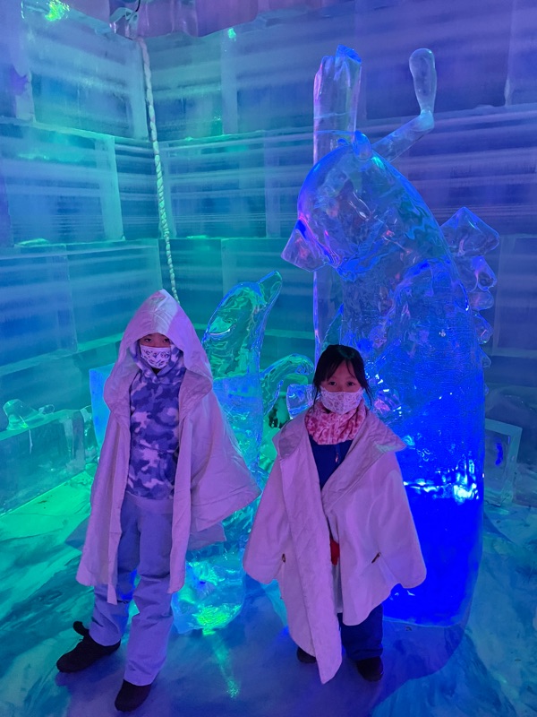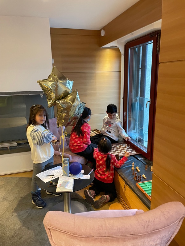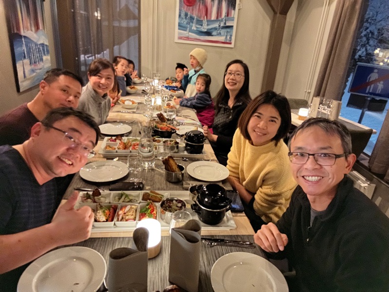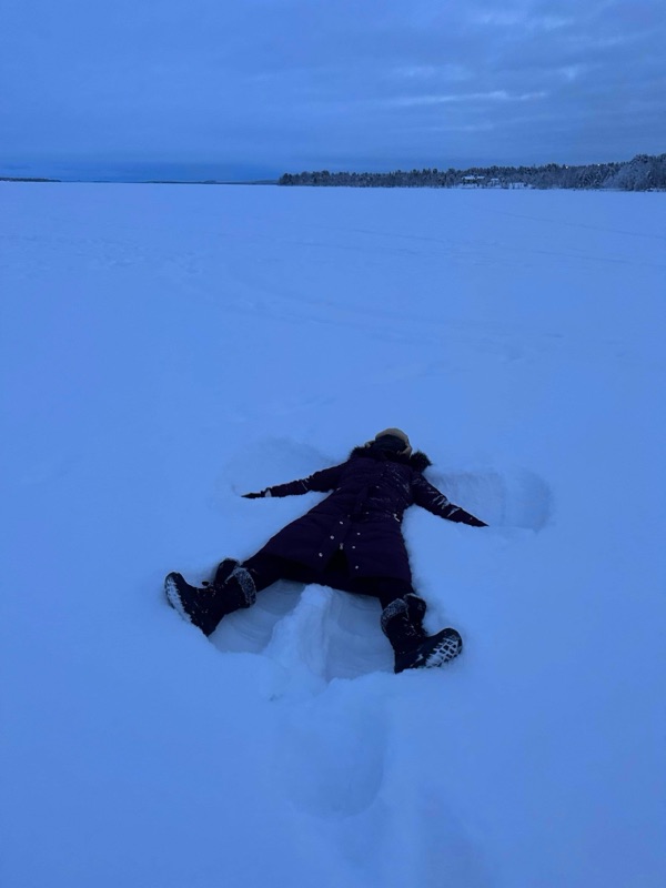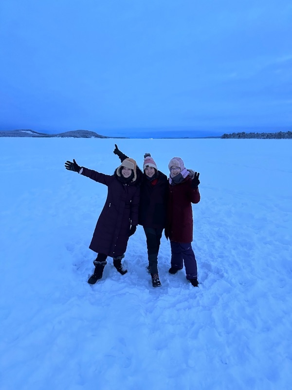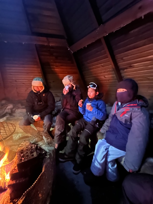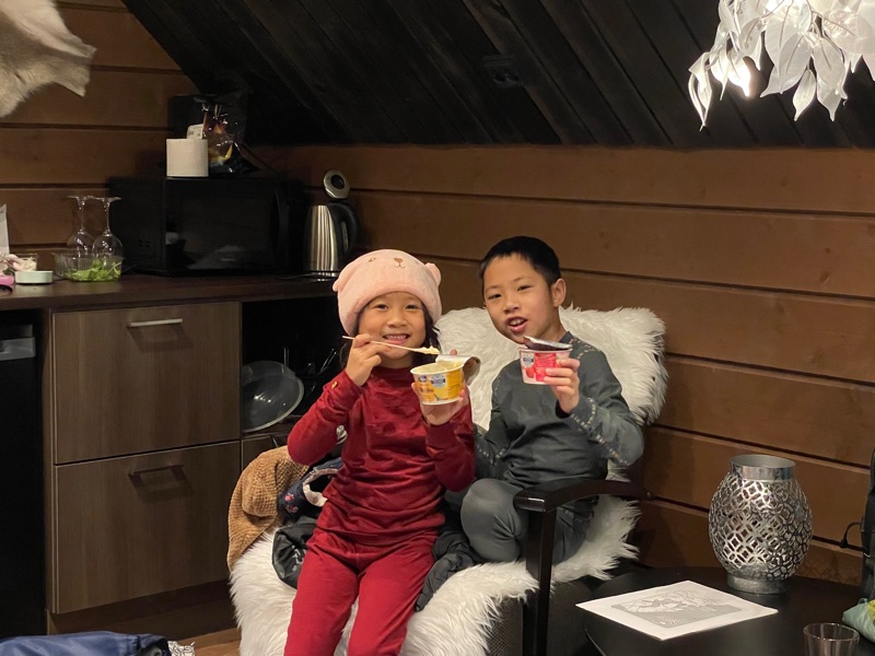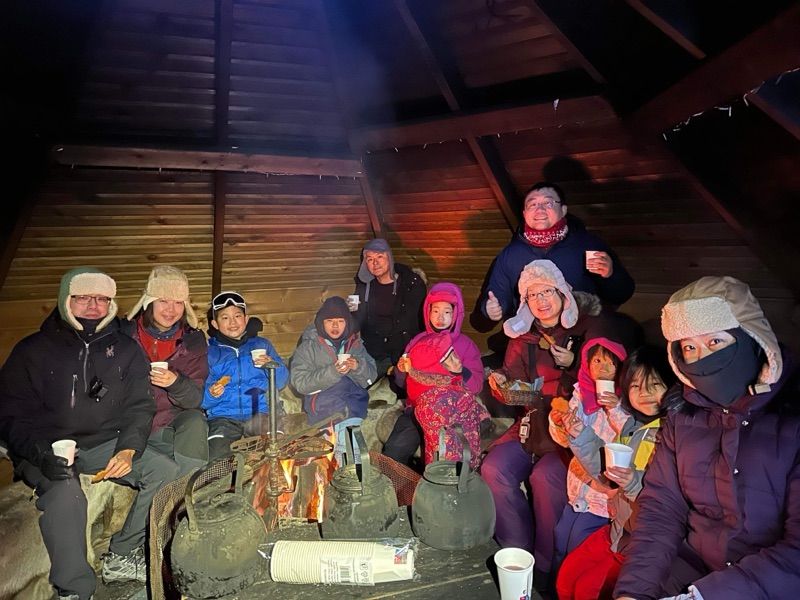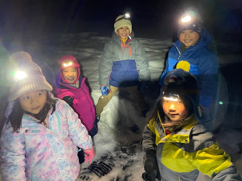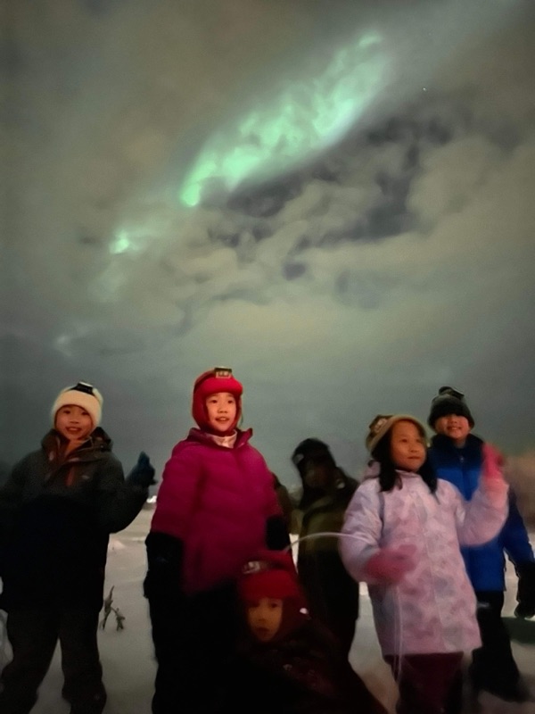 晚上大家一起到湖邊等極光奈何天公不做美雲層超級厚。即使極光指數再高也沒轍。還好小朋友們一樣只要有雪玩就開心。