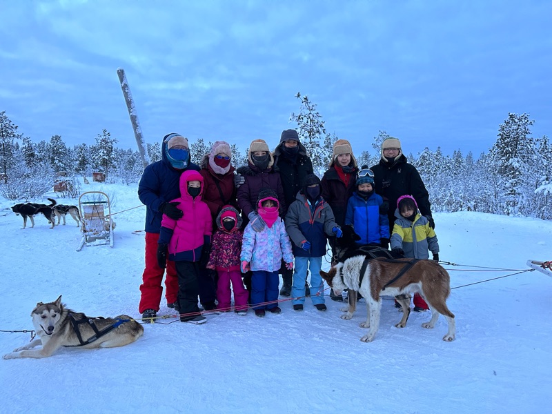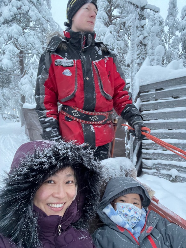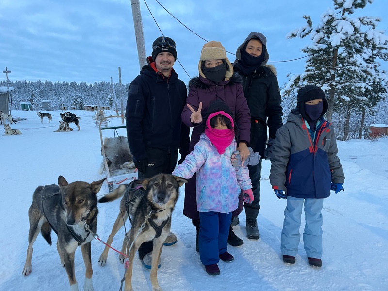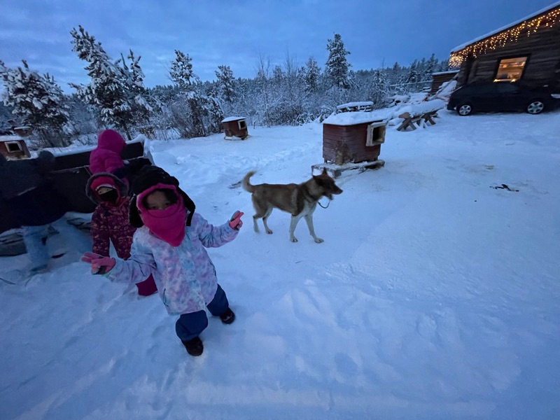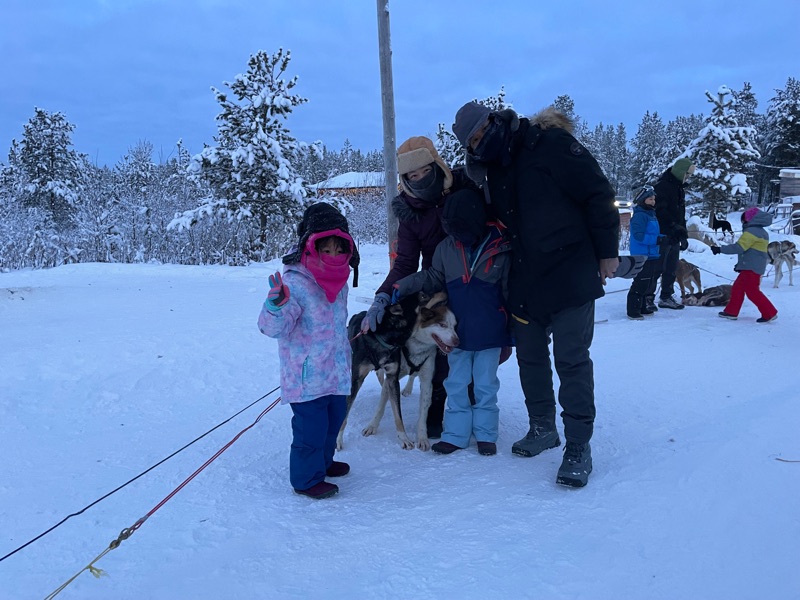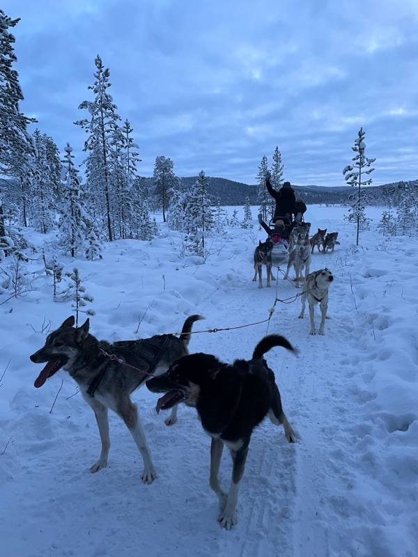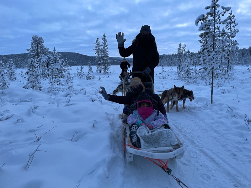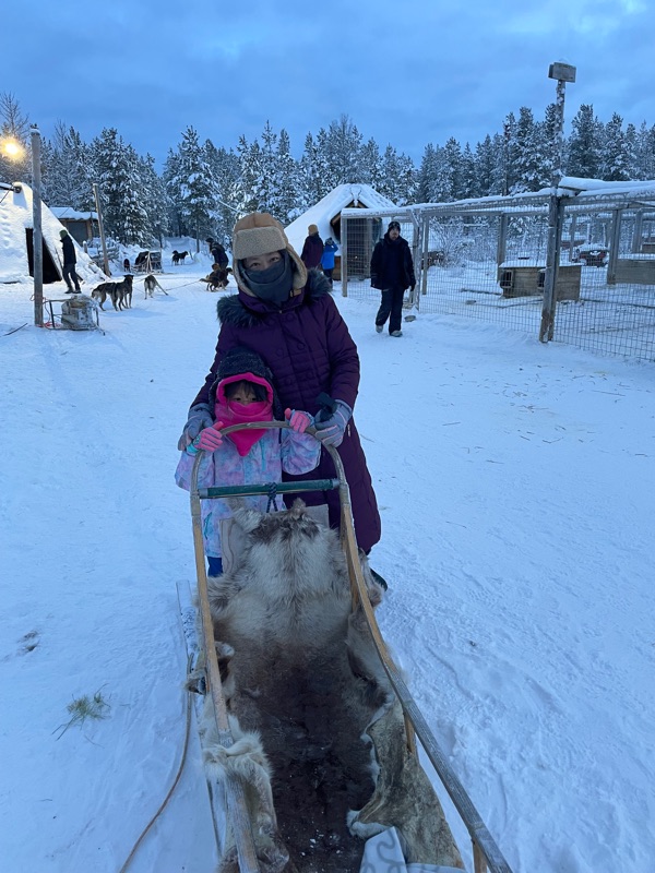 Visit Inari 其實也有提供很多自費活動,但研究後覺得這間性價比高,也可以選擇只要坐30分鐘(出發前看了很多遊記,怕太久在雪橇上凍僵)。到達園區後著裝坐上雪橇,狗狗們都超級興奮狂叫。三家人分成三隊,每隊由5隻狗狗帶領,爸爸們都站在後面指揮。一開跑後狗狗們就馬上安靜下來,賣力在銀白色的雪地裡奔馳。如果中途停下狗隊長還會有點小不爽。兩小坐在前面,非常享受這個過程,回到狗舍時還一直黏在狗狗旁摸頭不想走。雪橇結束後領隊帶大家到園區一個木屋裡烤炭火吃餅乾喝熱果汁。滿推薦這裡的狗雪橇,只要先預訂好,行程彈性,可長可短。路線是穿過一小片樹林後在開闊靜謐的雪地上繞一圈彷佛整個世界只有我們(和二哈),難以言喻。