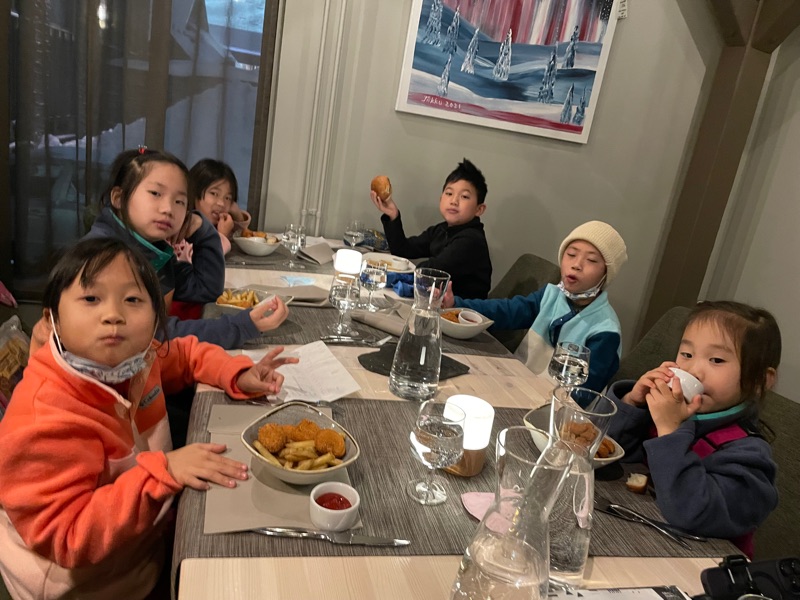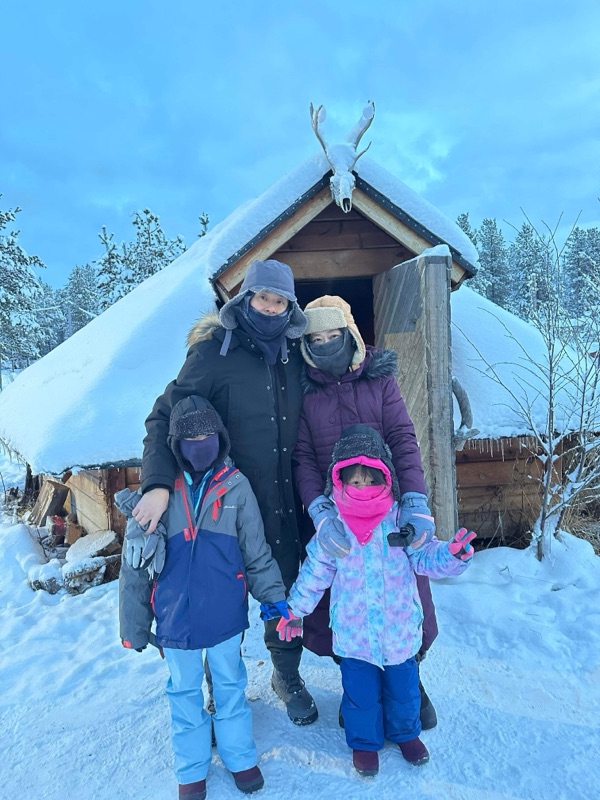 結束後返回的路上在超市買了些熱食回小木屋稍微休息一下後就準備到提前預約的sauna 和jacuzzi冰火五重天啦! 芬蘭的sauna是加熱器將石頭燒熱再舀水淋上產生蒸汽。正統的桑拿應該要先沖澡再進去蒸但我們包場穿著泳裝就進去了。其實小朋友們在桑拿房根本待不住進來一下就喊悶衝到外面jacuzzi泡熱水了。三個媽媽躺在桑拿聊天好素喜。蒸一下後到外面泡熱水但是從桑拿房走到室外就是一種酷刑: -10C 披著浴巾穿著溼掉的衣服不防滑的拖鞋亦步亦趨勉強在被凍成冰棒前跳進池裡。