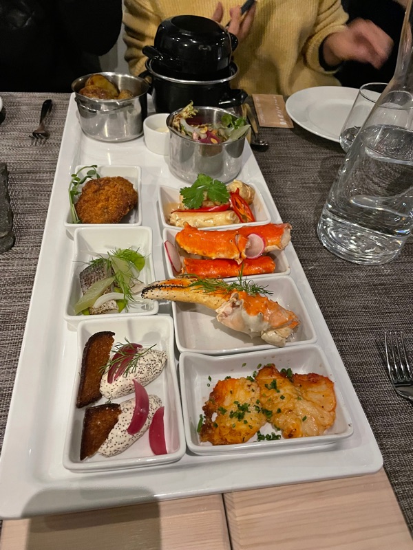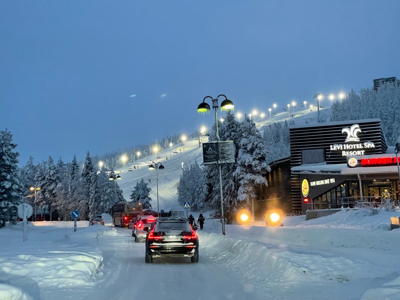 今天往南開回Rovaneimi。之前在安排行程時發現很多人到Inari都會參加更北邊挪威Kirkenes希爾克內斯的抓帝王蟹吃到飽,而我們因為停留天數短無法如願。吃貨們為了吃帝王蟹回程時繞到滑雪勝地Levi 的 KING CRAB HOUSE。當天下大雪,為了安全我們選擇開繞遠一點的大路。到了餐廳已經下午2:30了。可能因為期望很高,吃完了有一種不過如此的惆悵感 🥲 下次來Levi希望是來滑雪,整個山頭都是纜車,看起來非常壯觀。