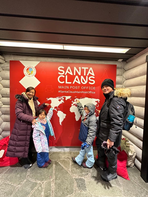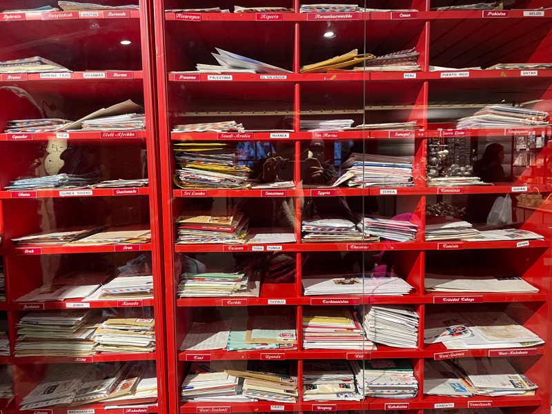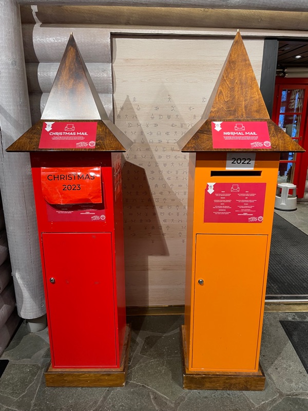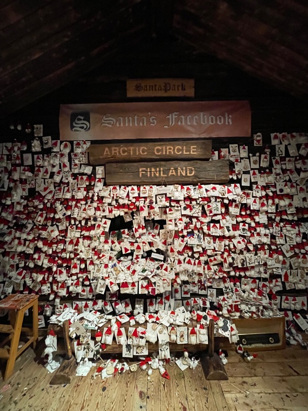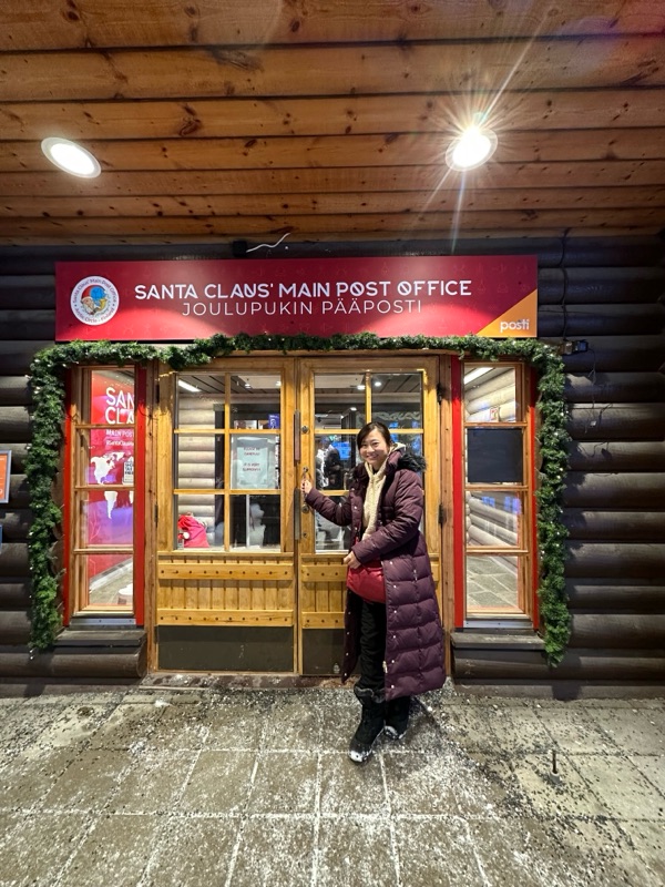 即使我們才剛從Inari回來,但來到聖誕老人村,當然要和北極圈線照相了。聖誕老人村的入口處剛好跨越北緯66°33′ 。這條線以北的範圍就是北極圈,園區還有提供網上即時錄像,可以和世界各地的親朋好友連線共賞美景。剛好今天鵝毛大雪,非常有儀式感。指路牌有亮點! 接下來到聖誕老人辦公室二樓買明信片和郵票。寫好後再走到聖誕郵局投寄。郵局裡有一區來自世界各地寄給Mr. C的信,也有台灣喲。明信片在回到美國後二個禮拜就收到了,郵戳很特別有紀念價值。
