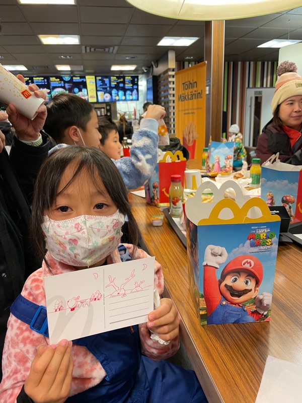 自從麥當當退出俄羅斯市場,Rovaniemi 的麥當勞又回歸世界最北的據點。用餐時間來真的是人滿為患,而且菜單上沒有麥香魚。兩小毫無新意的點了麥克雞塊,據說糖醋醬吃起來和美國的不太一樣,略遜一籌。離開前別忘了到點餐處拿一張免費極光明信片。
