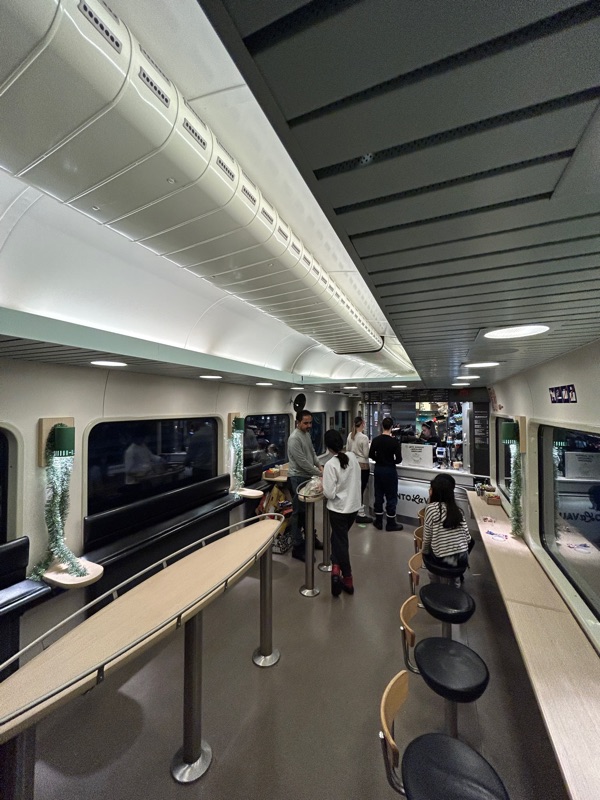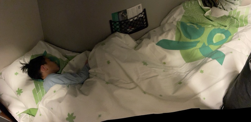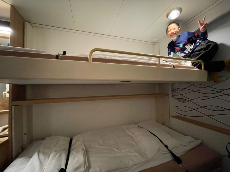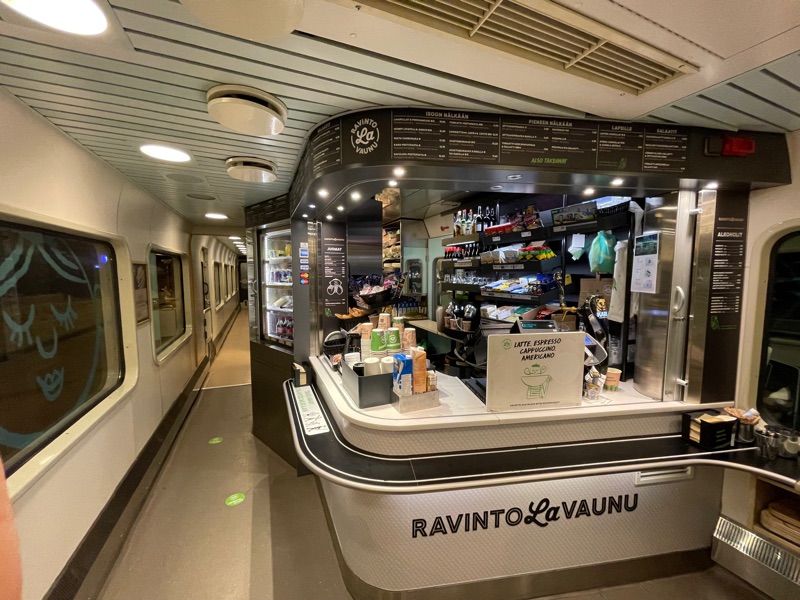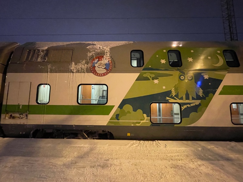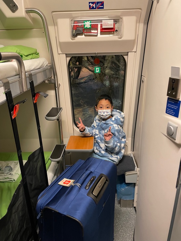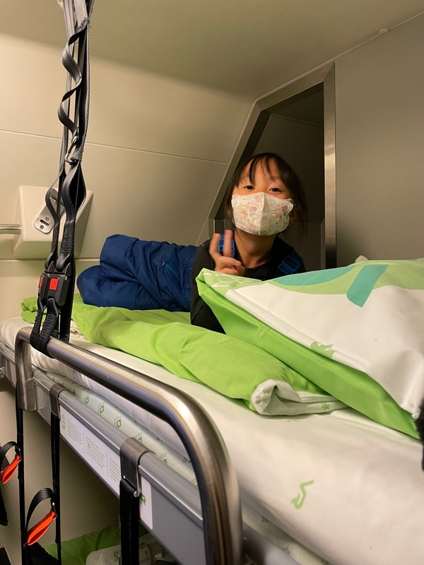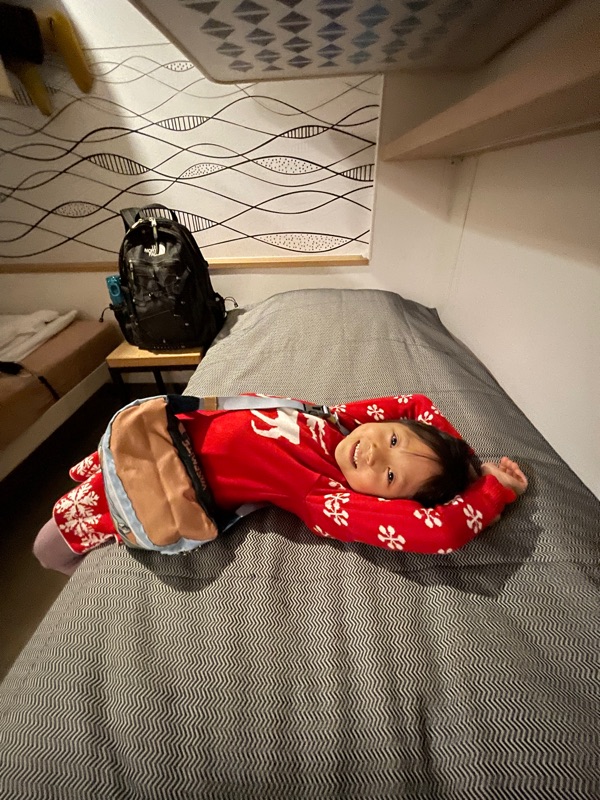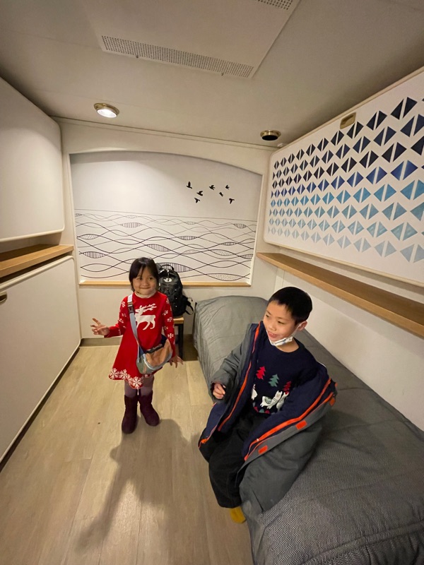 離開Santa Park我們又衝回minimani採買晚餐和第二天的早餐。因為今晚要搭北極特快車回赫爾辛基,之前看很多部落客分享臥舖艙非常小,雖然已經做好心理準備,實際看到還是有點驚訝。我們定了兩間有衛浴的房間,一大一小睡一間,仍然覺得空間十分窘迫。但床舖是很舒服的,除了房間小其他沒毛病。每張床上都附了一罐飲用水和毛巾,旁邊還有充電座和夜燈。淋浴間隱藏在廁所的鏡面後,非常節省空間。列車上還有提供共用衛浴的臥舖以及座位。在此強烈建議要訂有附衛浴的臥舖艙。我們走到其他車廂晃晃,發現坐位車廂以及共用衛浴臥舖的味道有點一言難盡。且若是一放票就訂其實也不貴,二間含衛浴的臥舖共€138。但人生第一次體驗夜車臥舖,無價!