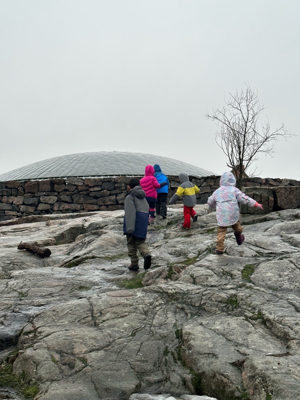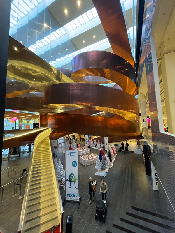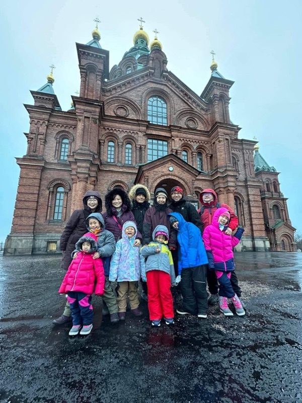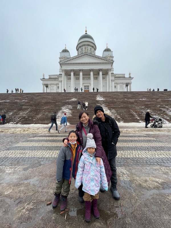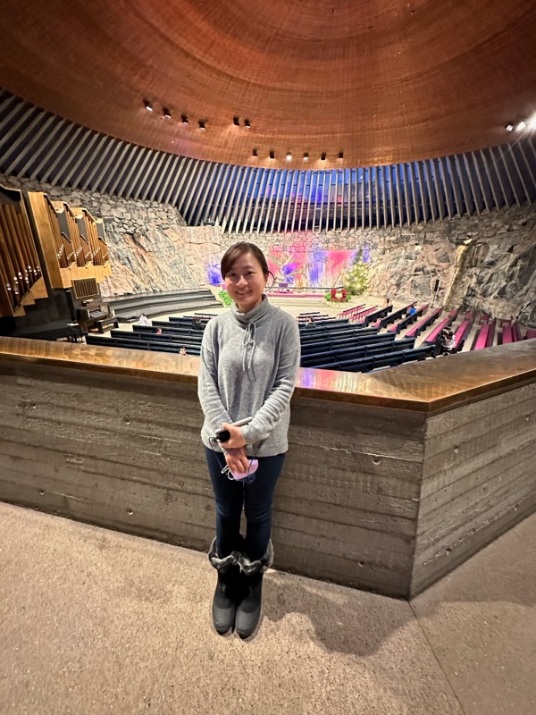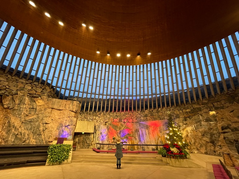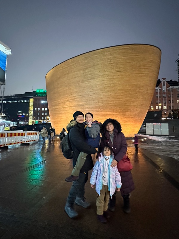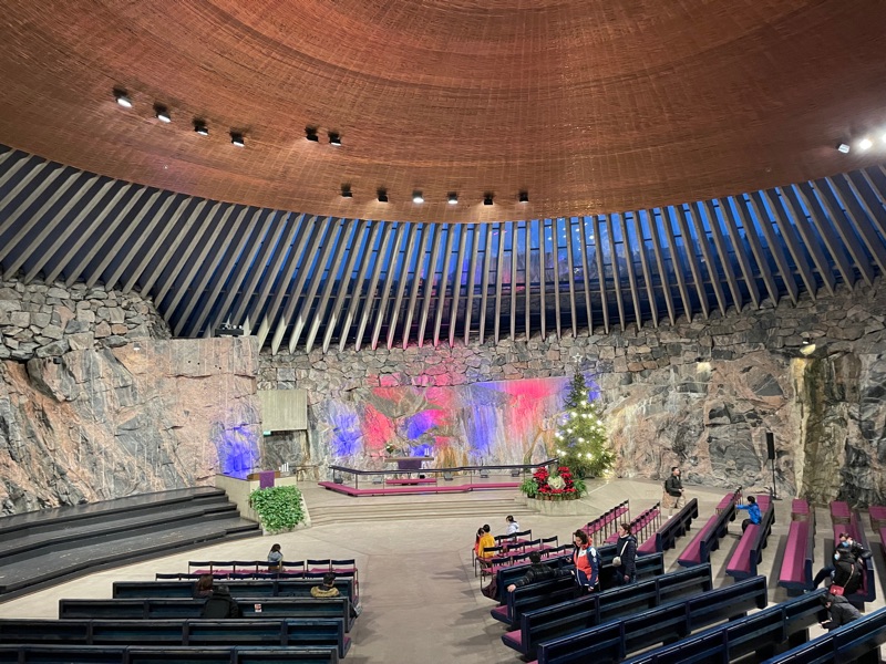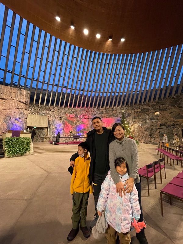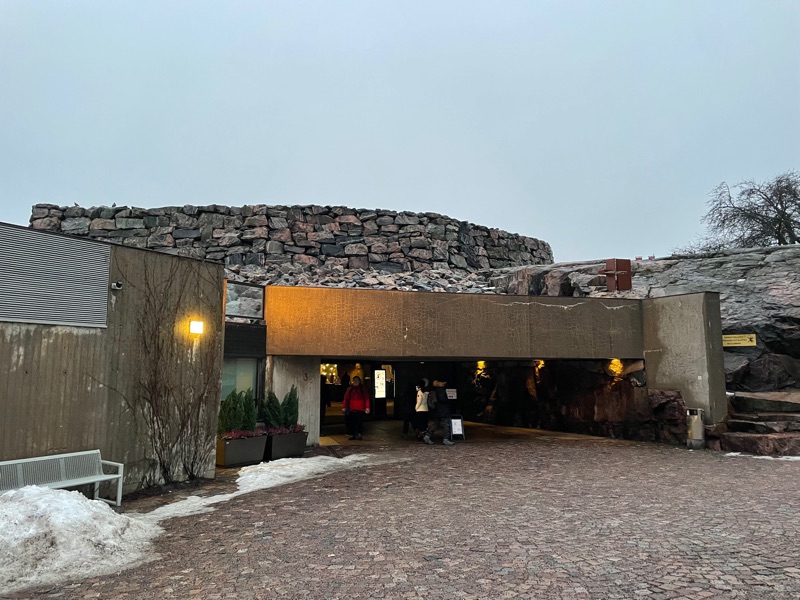 抵達岩石教堂後一行人在教堂屋頂來來回回不得其門而入,繞了一大圈終於找到大門。入內參觀需要付費,但是非常值得。教堂本身由大岩石挖鑿建築而成,金屬圓頂靠放射狀樑柱結合岩壁及環狀玻璃。當天的自然光有點偏藍,加上祭壇上打的燈,讓教堂不因為是岩石的內部而顯得清冷,反而有股溫潤的氛圍。 入口前迴轉便能上二樓,俯觀教堂內部,線條錯落有緻,卻又有種潤物無聲的和諧感,讓人嘆為觀止。靜默教堂座落在Kamppi車站旁,遠看就像一個巨大的澡盆。抵達時入口上貼了一個告示說暫時關閉,不知何時會再開放。拍完照後便到旁邊的Fazer Cafe Kamppi 補充熱量。冷冷的天吃個蛋糕喝杯咖啡真是享受。小朋友跟著我們走一天其實也很累了,蛋糕吃到一半直接斷線。於是爸爸們把小朋友帶回飯店休息,媽媽們到LV開開眼界。據說赫爾辛基退稅高,是買LV最划算的地方。但我們在陰雨綿綿的天氣中排了一個多小時,進去晃了30分鐘,沒看到什麼中意的,全身而退。