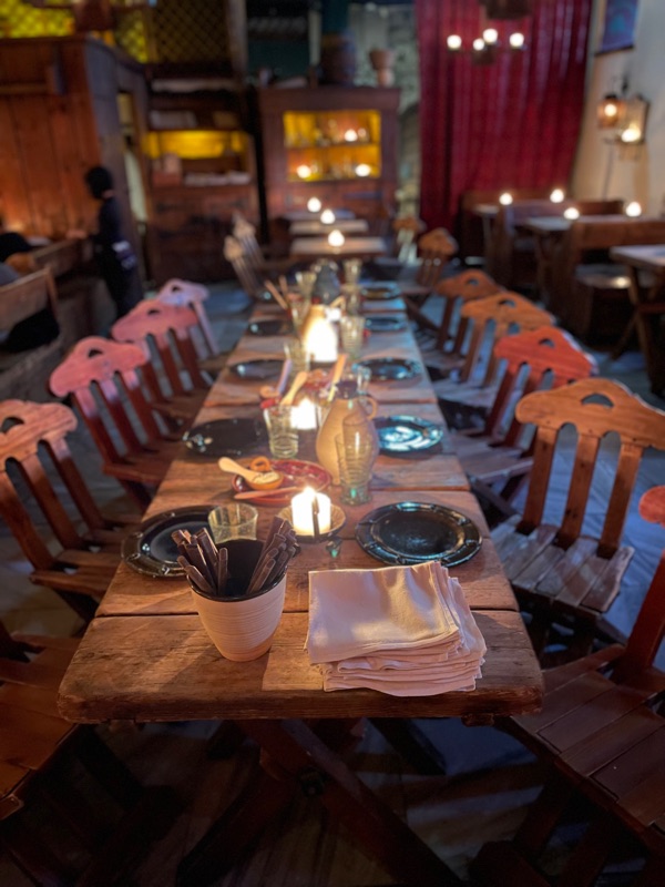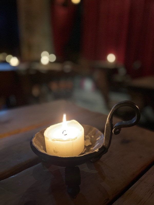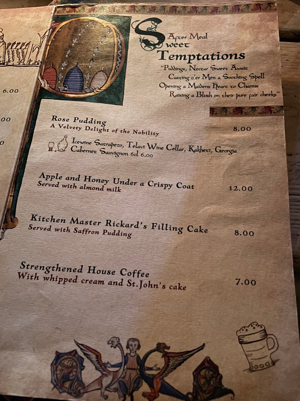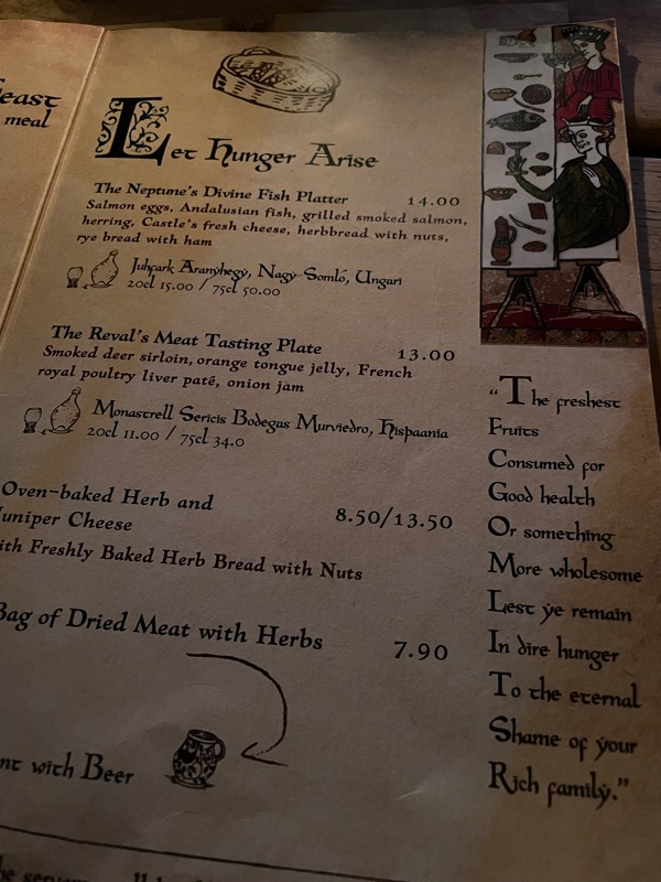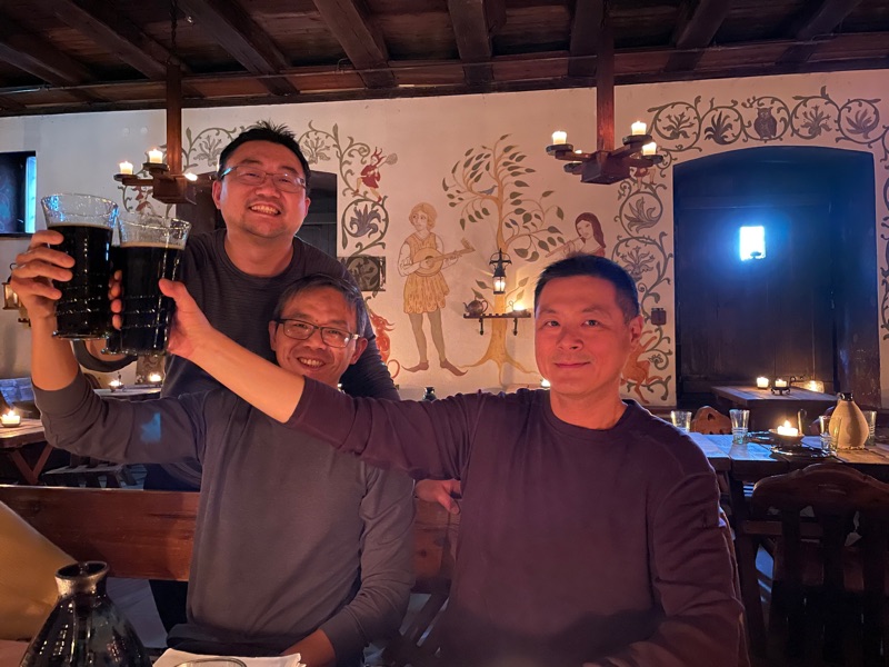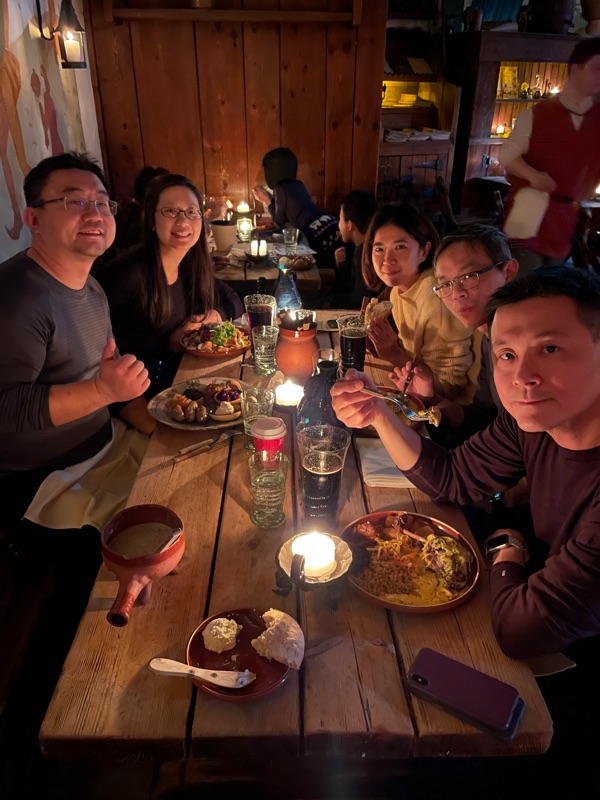 走走逛逛來到塔林有名的中古世紀餐廳Olde Hansa。先在門口的小攤子買了杏仁糖解解饞 (有點像糖炒栗子,但用的是去殼的杏仁,另加了一些香料) ,再入內用餐一進門暈黃的燭光復古的陳設服務生精心裝扮相迎不道遠恍惚中穿越時光隧道落座中世紀橡木大桌觥籌交錯。Olde Hansa的菜單也是力求擬真,除了一般肉類,還有熊肉鹿肉和野豬肉做成的狩獵香腸。吃了一口香腸覺得野味很重,有點食不下嚥。配菜大多是豆子和醃漬的甜蔬菜。這餐覺得最好吃的大概是餐前麵包和奶油蘑菇濃湯吧。雖然菜色不怎麼對我們胃口, 來嘗鮮體驗一下中世紀情懷還是挺不錯的。