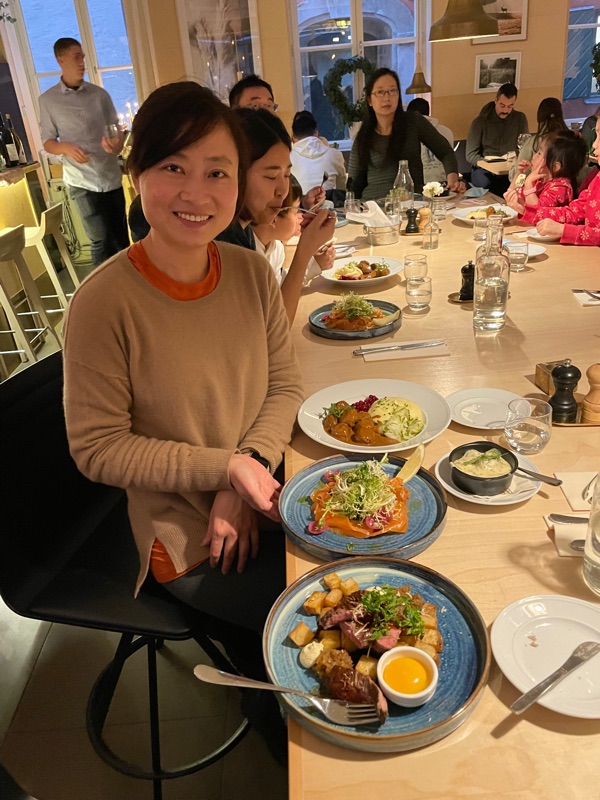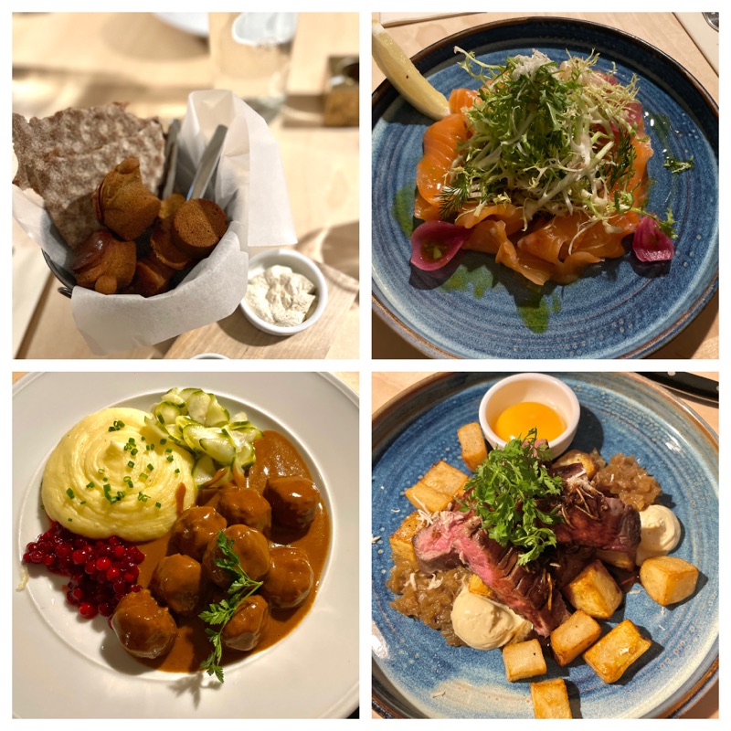 午餐選在老城區的Restaurant Tradition。這裡提供瑞典當地的經典菜餚,如瑞典肉丸、馬鈴薯餃瑞典煎牛肉(beef rydberg)。我們點了肉丸、牛肉和燻鮭魚冷盤。餐前麵包有穀物脆片和長得像雞蛋糕的黑麵包,附上兩種沾醬。肉丸擺盤簡直就像藝術品,絲滑的馬鈴薯泥,惹味的酸黃瓜,一顆顆像紅寶石的越橘,襯托沾裹著濃郁奶油醬汁的肉丸,完全就是視覺和味蕾的雙重饗宴。Beef rydberg的牛肉外酥內嫩,搭配酥脆的馬鈴薯塊和焦香的洋蔥,佐以芥末醬和蛋黃提味,也是讓人心滿意足。唯一的遺憾就是燻鮭魚實在太鹹,即使搭配新鮮生菜還是難以下嚥。但整體而言瑕不掩瑜。
