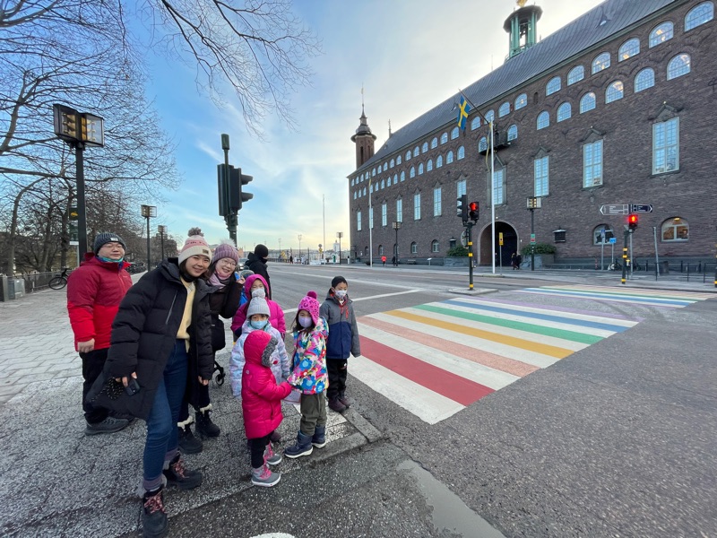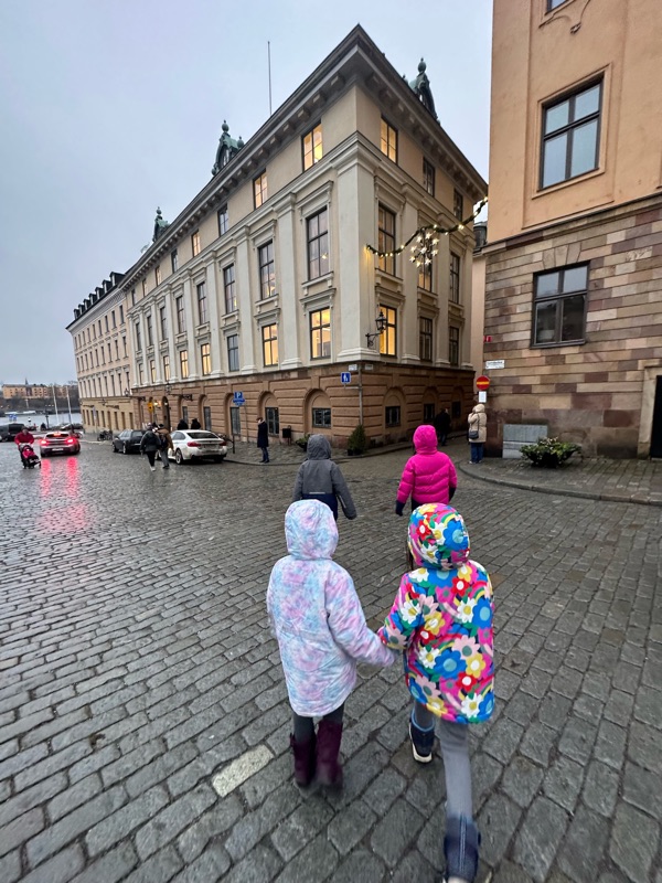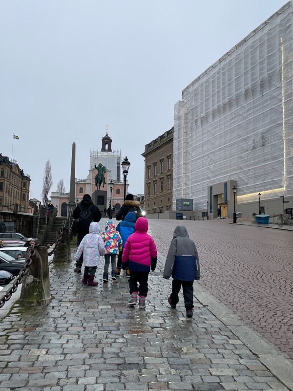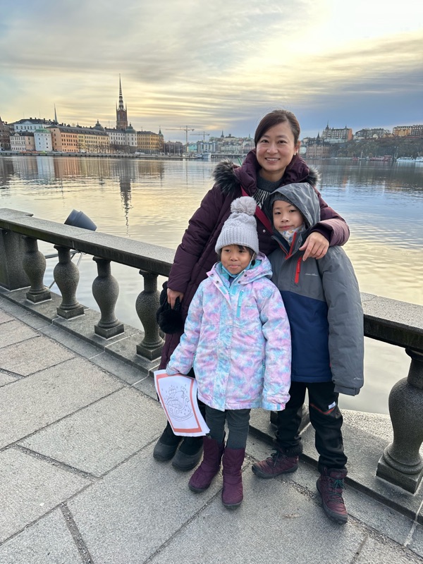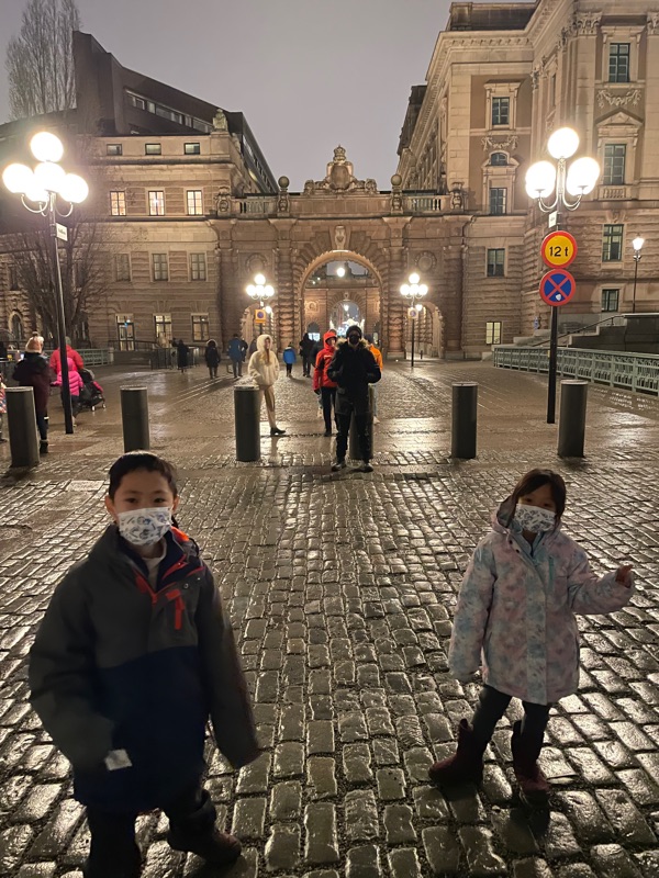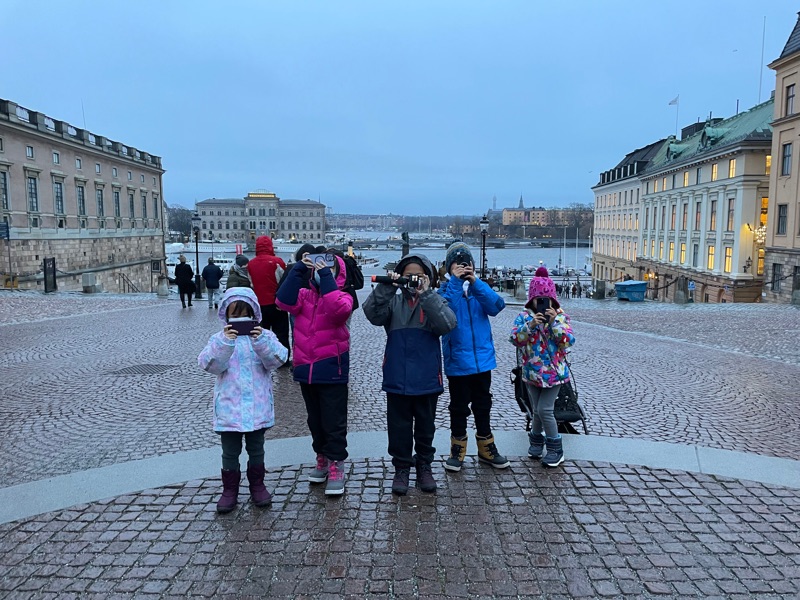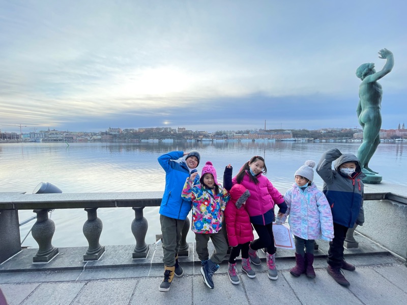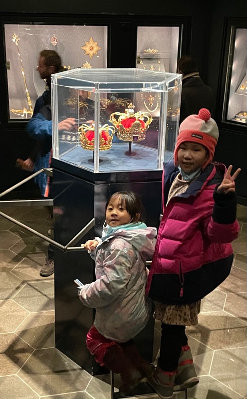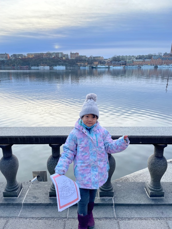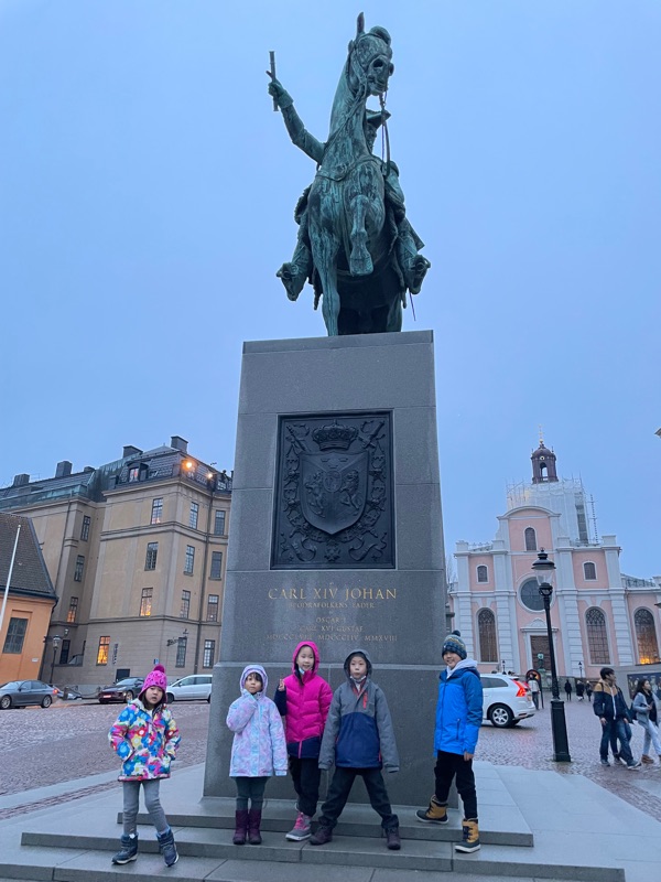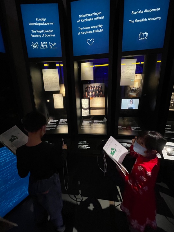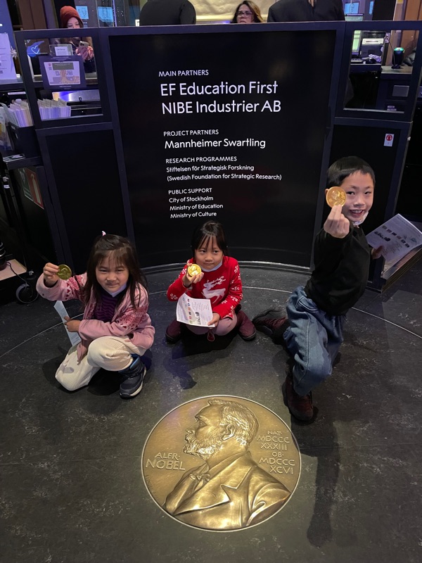來瑞典怎麼能不到諾貝爾博物館參觀至高榮譽的殿堂? 小朋友一進去就拿到一份闖關遊戲,邊瀏覽邊紀錄。印象比較深刻的是有幾支電話聽筒,拿起來會聽到當初通知得獎人時的錄音,好幾通都是得獎人很平靜,但是背景會突然爆出巨大的歡呼聲。還有一區是介紹諾貝爾晚宴的食物,從食材到擺盤都別具匠心,還用投影的方式把一道道佳餚展示在碗盤上,讓參觀的人可以視吃。我們到的比較晚,走馬看花,離開前交回完成的遊戲。每個小人得到一枚諾貝爾金幣(巧克力),拍完照後瞬間就被他們放到肚子裡保存了。