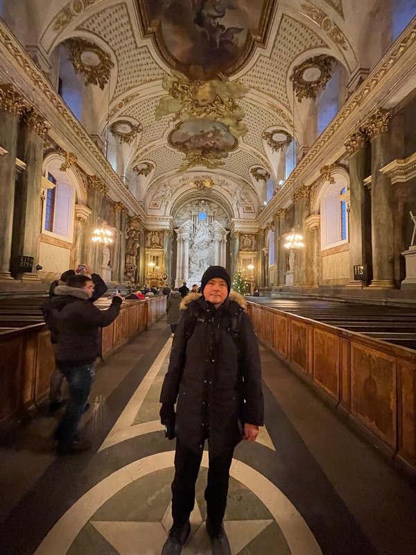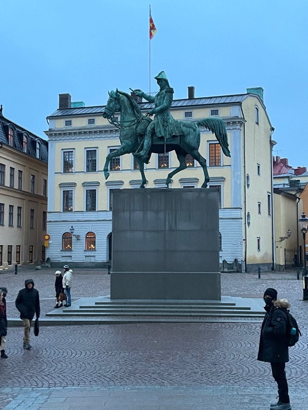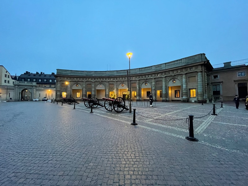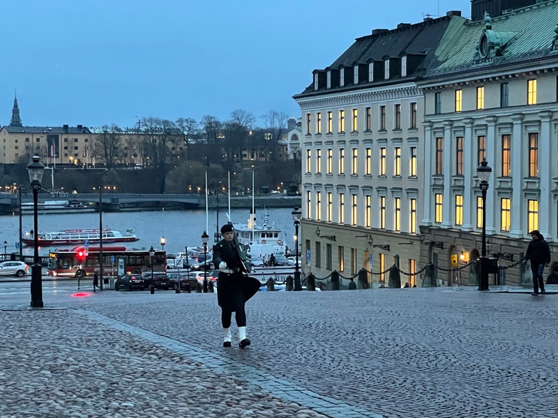 用完餐便往皇宮前進。瑞典皇宮(Royal Palace of Sweden) 是瑞典君主的官方居所及工作場所。它是瑞典最大的皇宮,也是歐洲面積最大的宮殿之一。宮殿側門前廣場有一個將軍的青銅雕像 (Charles XIV John's statue)。拍照時剛好看到一個衛兵英姿颯爽正步走進門口的小哨站。側門進去是瑞典皇家教堂,金碧輝煌。但我們只進去匆匆一瞥,就因接下來有儀式而閃退。