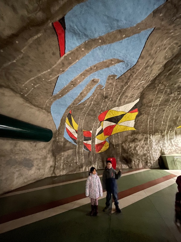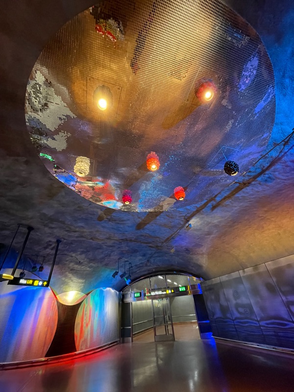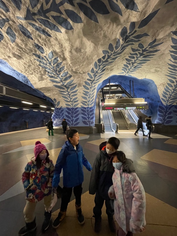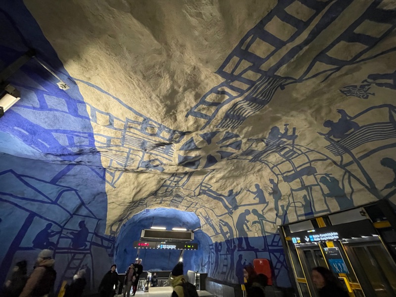 來之前就耳聞瑞典的地鐵站像個藝廊,為了把我們的48小時地鐵票價值發揮到極致,決定晚餐前快閃藍線幾個比較出名的地鐵站。第一站T-Centralen是斯德哥爾摩的中央車站,也是地鐵紅、藍、綠三條線的交會點 車站壁面上由藍、白兩種顏色編織出大型的花朵與葉片,隨著綿延起伏的岩壁搖曳生姿。到了轉乘通道內則變成了工人與鷹架的圖案,據說這是設計師對參與地鐵興建人員的致意。