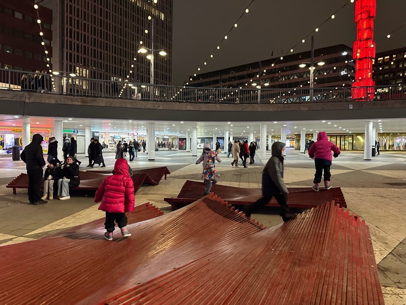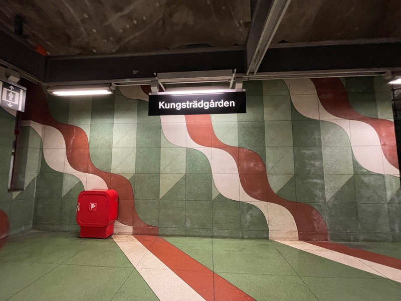 第二站Kungstradgarden 國王花園站,設計者Ulrik Samuelson用綠、紅、白三種顏色表示地鐵站外國王花園與雕像。其實對這個地鐵站除了線條色彩鮮明外,就是一條很長很陡的電扶梯了。這站也是藍線的終點站。出來後發現離晚餐預定還有一段時間,便走到地鐵站附近的歌劇院參觀。大廳有一棵夢幻色彩的芭蕾舞鞋聖誕樹和一個歌劇院模型。雖然因有演出不能一睹廳內風采,但也可以透過模型身歷其境。