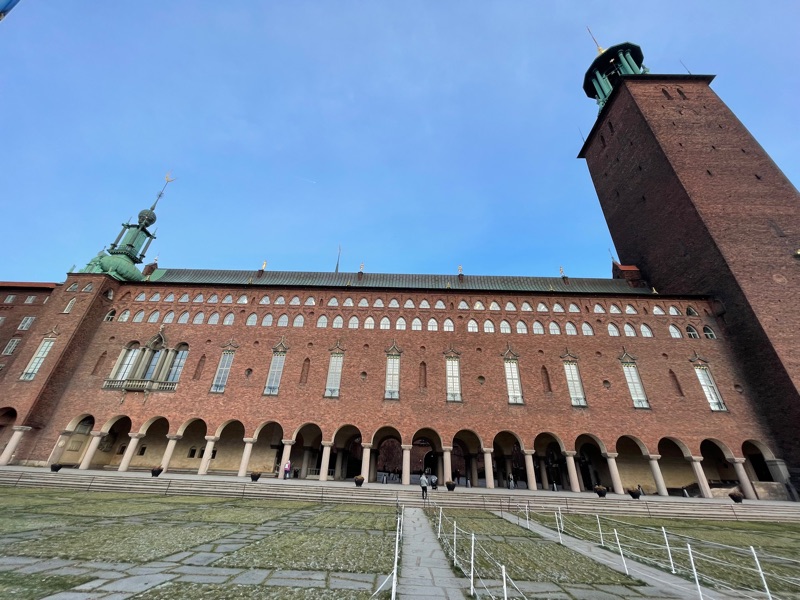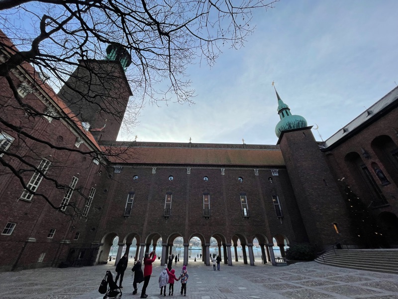 早上來到斯德哥爾摩市政廳隨興走走。典雅秀麗的紅磚建築物中間有一個寬闊的廣場,穿過一整排拱門和長廊便來到外庭院。棋盤似的草地上鋪了一層薄霜,還有兩個扇貝狀的小噴泉點綴其中。 在角落的塔樓巍峨聳立,頂端有象徵著瑞典光榮歷史的三王冠,代表瑞典、丹麥、挪威三國人民的合作無間。臨水平台和粼粼湖光無縫接軌,雖然天氣陰晴不定,天光雲影倒也相映成趣。