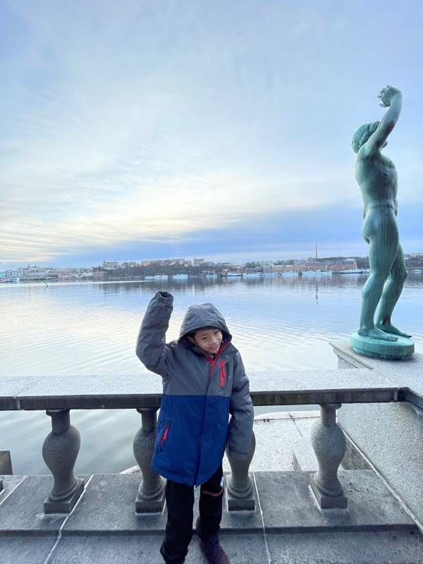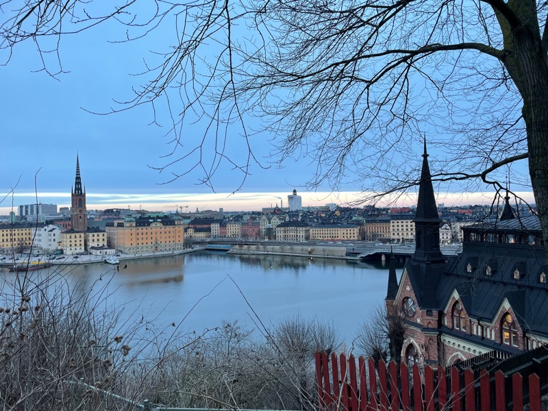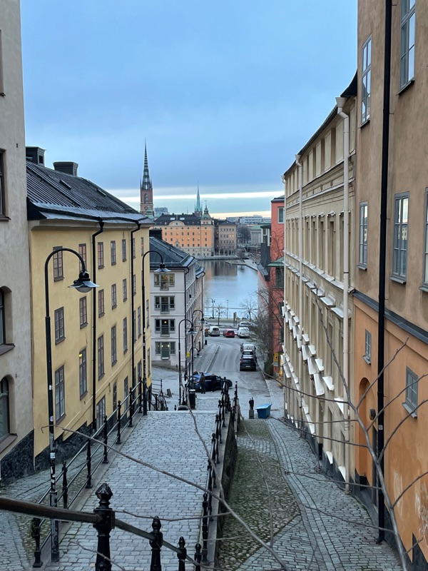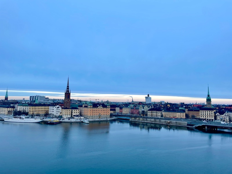 餐後我們在街上溜達了一陣,便打道回飯店準備出發去機場。回到飯店前拐了個彎,先沿著古意盎然的石板路往上走到Monteliusvagen觀景台,隔著峽灣欣賞斯德哥爾摩水光瀲灩的市景,化為此次瑞典行的美麗縮影。