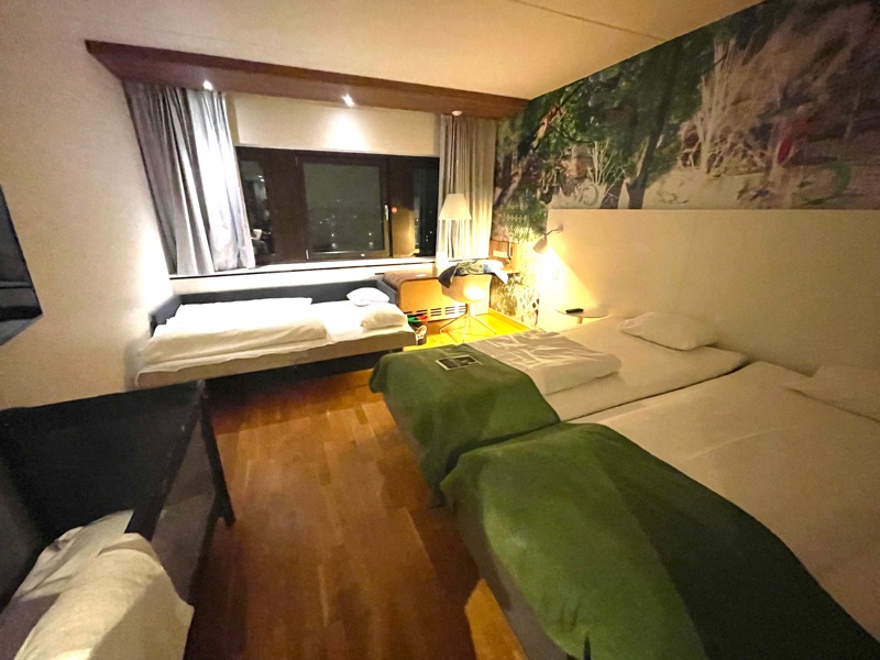 今天坐的渡輪一樣是Tallink Silja的Symphony 船上有多間餐廳、酒吧、夜店、兒童遊戲室和商店。船身第6層船艙上有具代表性的聖誕老人與嚕嚕米圖像。我們的房型是B class 4人房,一晚€89,沒有窗戶,上面兩張床翻下就變成四張單人床。但因為原本的房間在5樓,正好在夜店下方,房內一直縈繞著凍次凍次背景音樂。只好去服務台問能不能換房間,結果沒想到客服直接給我們一間9樓的房間,原本5樓的房卡也不用還。所以男生們晚上去睡5樓,女生們就睡在安靜的9樓 這樣安排突然覺得房間寬敞許多。