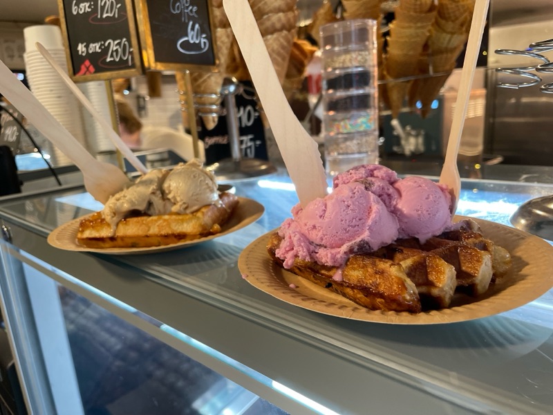 在市區逛逛解決午餐後,我們來到新港 Nyhavn準備搭乘運河觀光船。新港最著名的地標就是運河兩側的石板街道及排排站的彩色建築,建於 17~18 世紀,現在多為餐廳、酒吧、咖啡館。上船前到Vaffelbageren Nyhavn冰淇淋店歇腳。冰淇淋搭配熱熱的鬆餅,不敗的組合,非常好吃。船上配有一位現場導覽,詳細介紹沿途經過的景點。印象比較深刻的是因為下雨水位升高,有幾個橋拱就過不去了。航程中一掃而過舉世聞名的小美人魚雕像背影,以及慕名而來的眾多遊客。